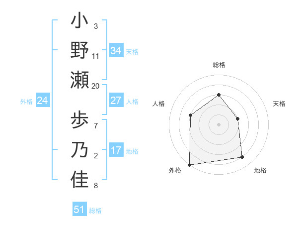 小野瀬 歩乃佳さんの総格は51画の3点!