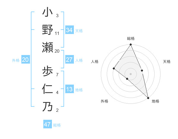 小野瀬 歩仁乃さんの総格は47画の5点!