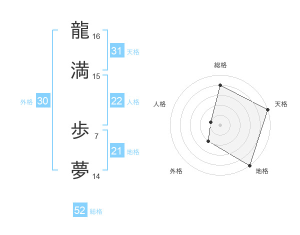 龍満 歩夢さんの総格は52画の4点!