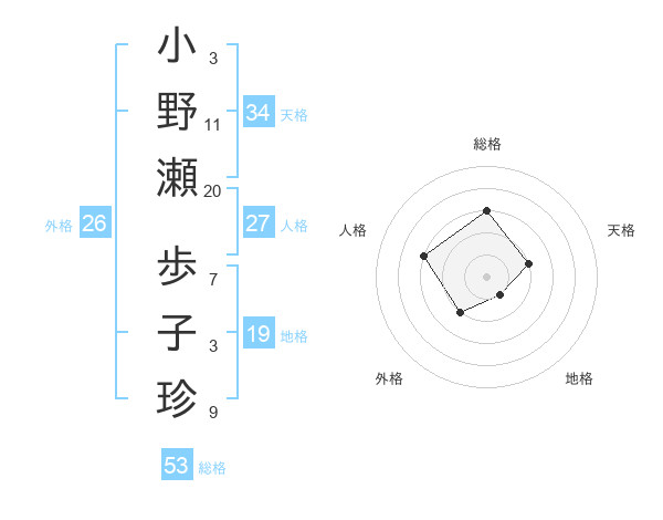 小野瀬 歩子珍さんの総格は53画の3点!