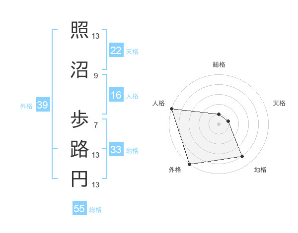 照沼 歩路円さんの総格は55画の1点!