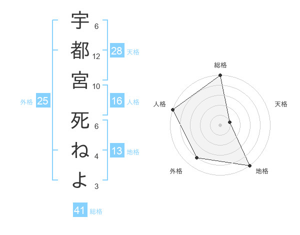 宇都宮 死ねよさんを姓名の画数から五運を鑑定