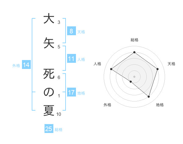 大矢 死の夏さんを姓名の画数から五運を鑑定