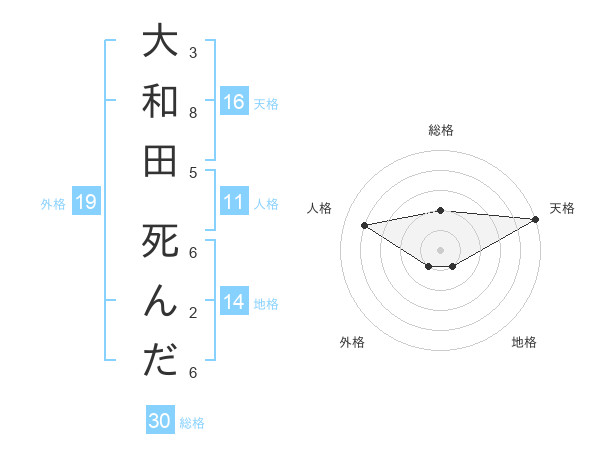 占い結果は姓名判断である以上、良い場合も悪い場合もありますが、決してお名前を誹謗中傷するものでなく、画数の自動計算によって得られたものです。また、本サイトの検索によって得られた鑑定結果で、第三者を誹謗中傷したり名誉を棄損するような行為を禁じます。