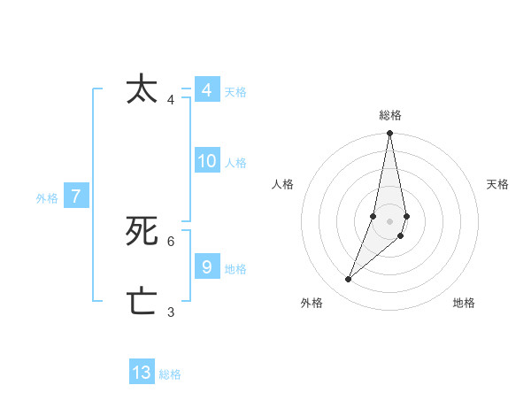 太 死亡さんの総格は13画の5点!