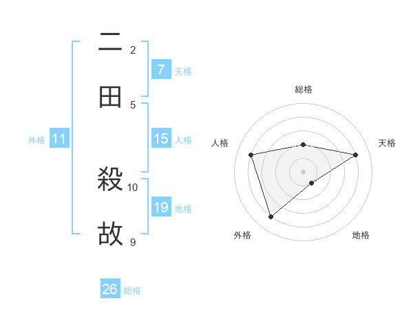 二田 殺故さんの総格は26画の2点!