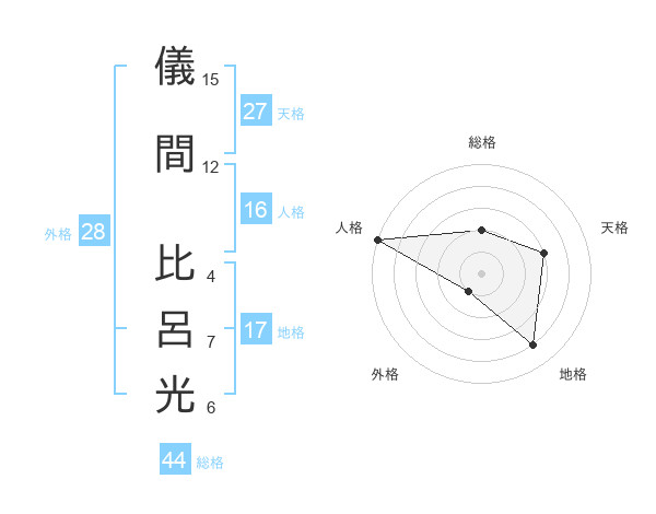 儀間 比呂光さんを姓名の画数から五運を鑑定