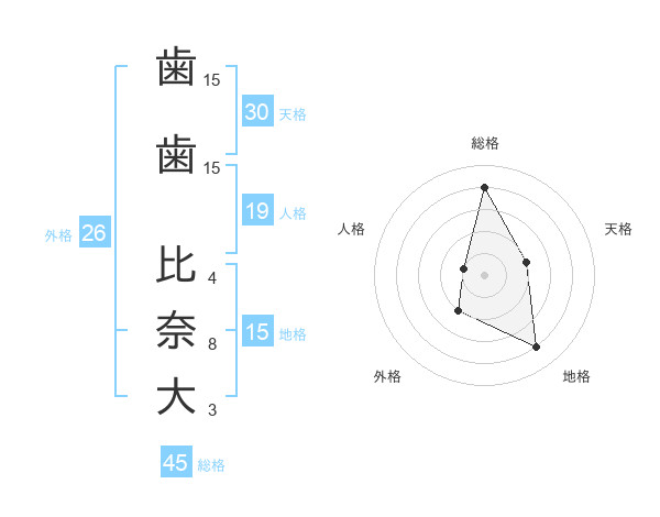 歯歯 比奈大さんの総格は45画の4点!