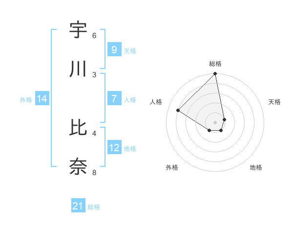 宇川 比奈さんの総格は21画の5点!