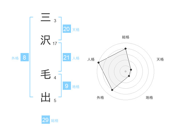 三沢 毛出さんの総格は29画の4点!
