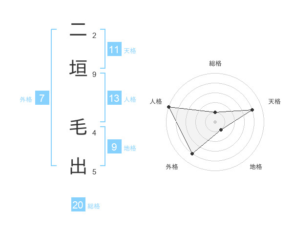 二垣 毛出さんの総格は20画の1点!