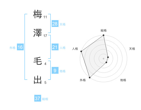 梅澤 毛出さんの総格は37画の5点!
