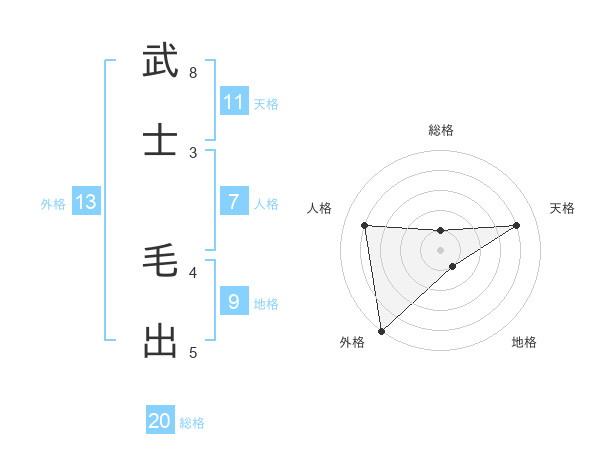 武士 毛出さんの総格は20画の1点!