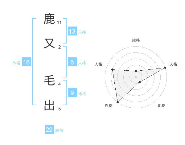 鹿又 毛出さんの総格は22画の1点!