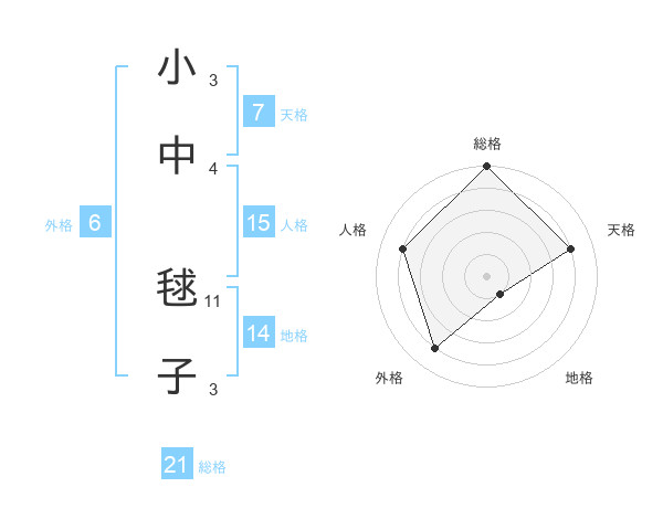 小中 毬子さんの総格は21画の5点!