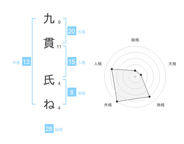 九貫 氏ねさんの天格は20画の1点!