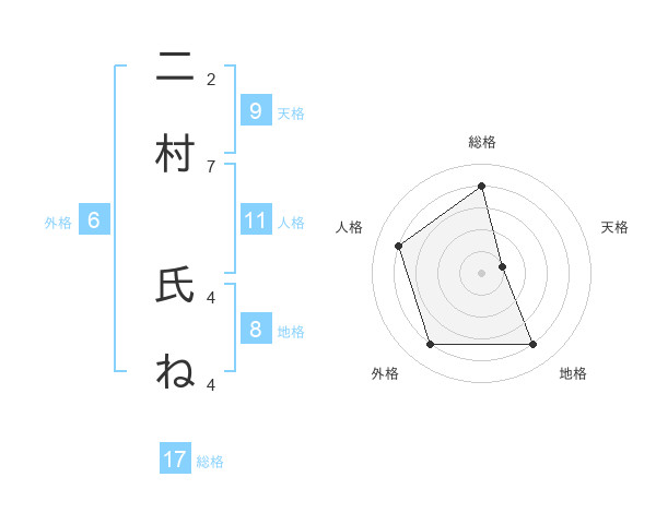 二村 氏ねさんの総格は17画の4点!