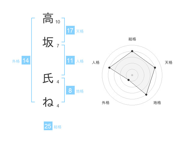 高坂 氏ねさんを姓名の画数から五運を鑑定