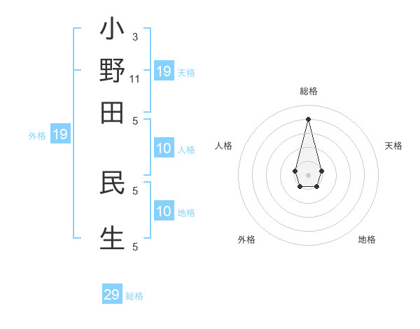 小野田 民生さんの総格は29画の4点!