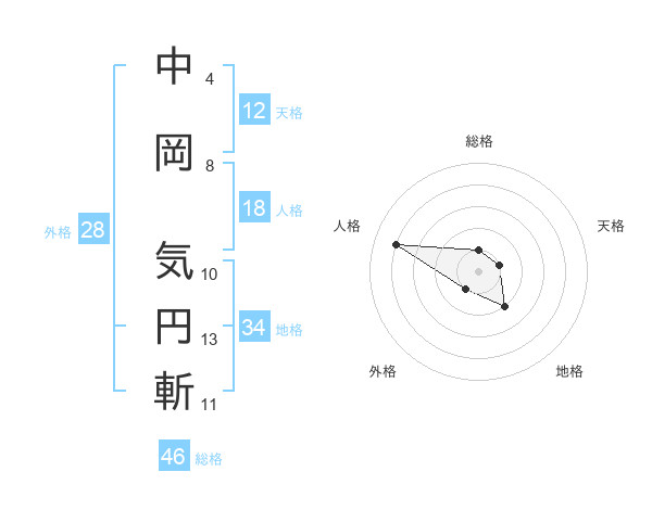 中岡 気円斬さんの総格は46画の1点!