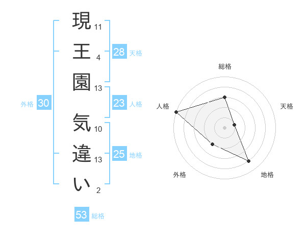 現王園 気違いさんの総格は53画の3点!