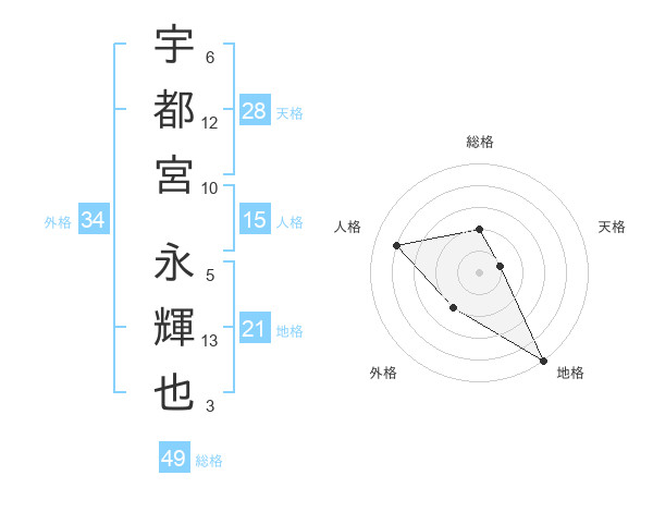 宇都宮 永輝也さんの地格は21画の5点!