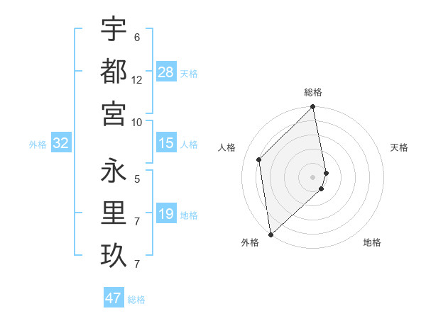 宇都宮 永里玖さんの総格は47画の5点!