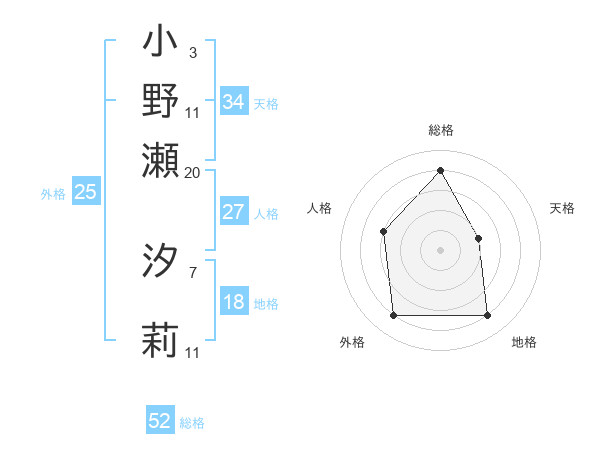 小野瀬 汐莉さんの総格は52画の4点!