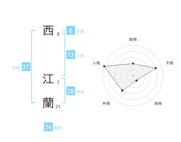 西 江蘭さんの総格は34画の2点!