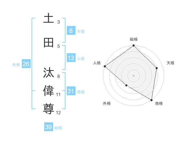土田 汰偉尊さんの総格は39画の5点