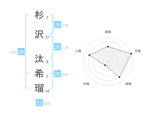 杉沢 汰希瑠さんの天格は24画の5点!