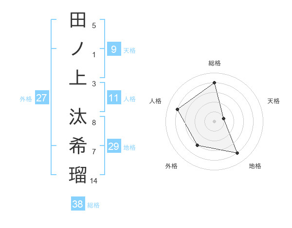 田ノ上 汰希瑠さんの総格は38画の4点!