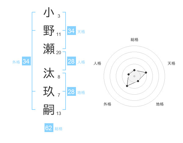 小野瀬 汰玖嗣さんの総格は62画の1点!
