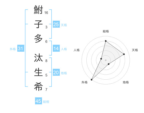 鮒子多 汰生希さんを姓名の画数から五運を鑑定