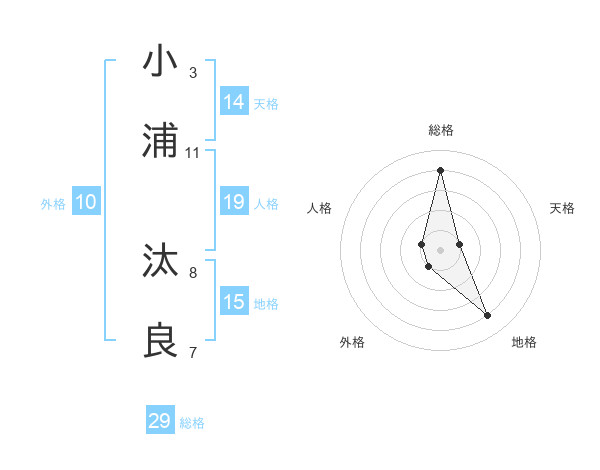 小浦 汰良さんの総格は29画の4点!