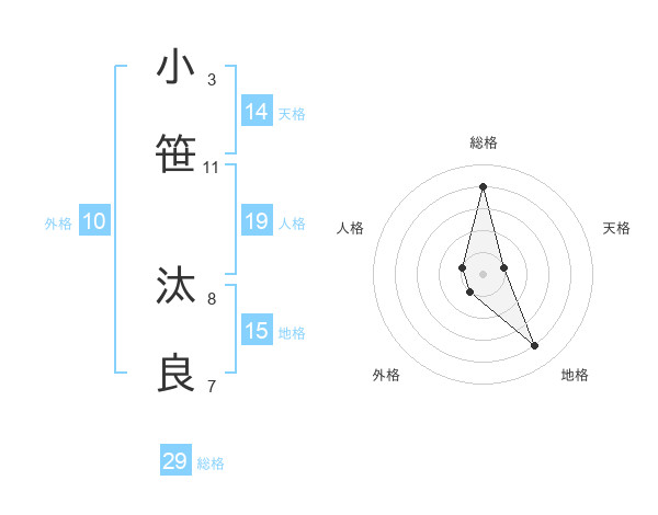 小笹 汰良さんの総格は29画の4点!