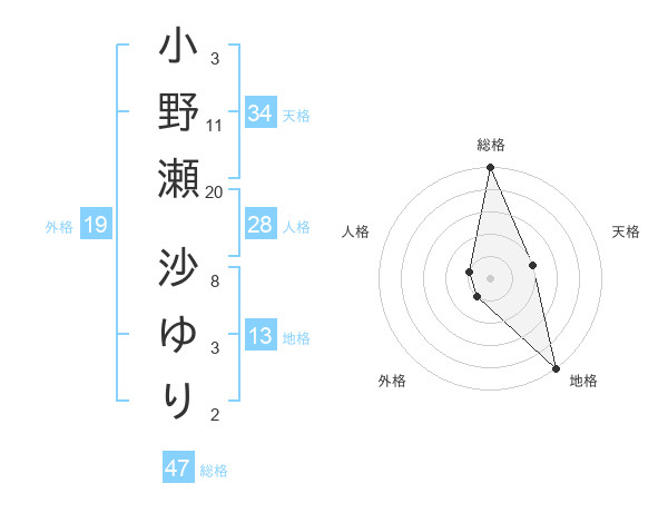 小野瀬 沙ゆりさんを姓名の画数から五運を鑑定