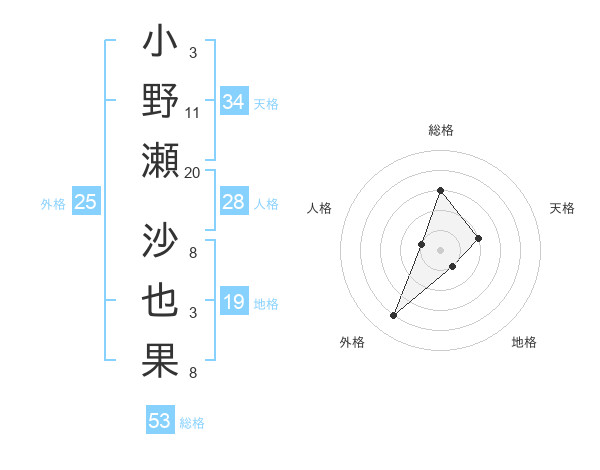 小野瀬 沙也果さんを姓名の画数から五運を鑑定