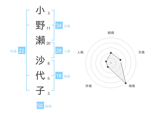 小野瀬 沙代子さんの総格は50画の2点!