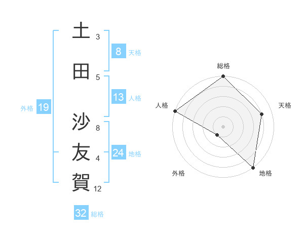 土田 沙友賀さんの総格は32画の5点!