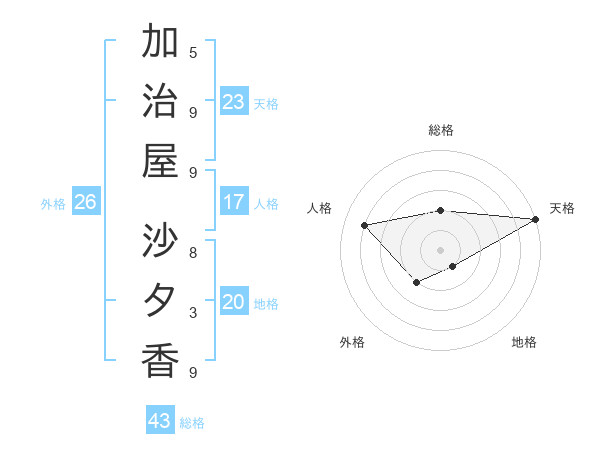 加治屋 沙夕香さんの天格は23画の5点!