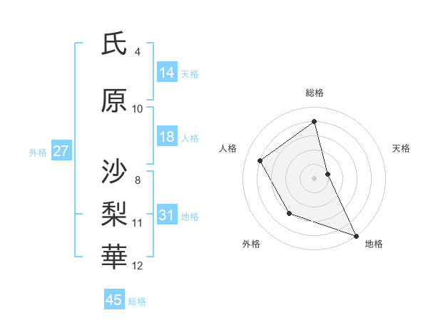 氏原 沙梨華さんの総格は45画の4点!