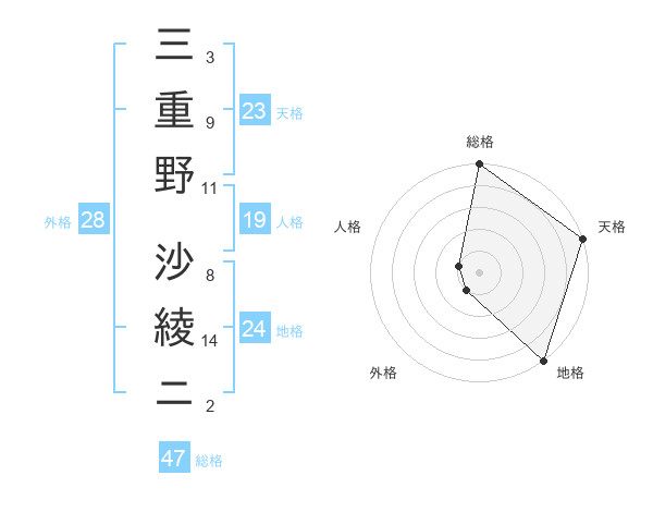 三重野 沙綾ニさんの総格は47画の5点