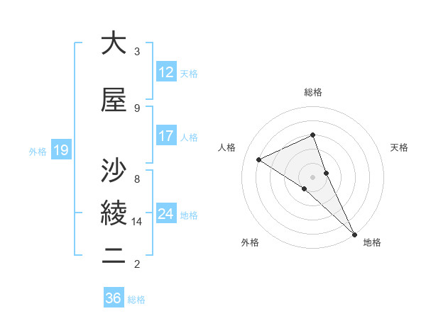 大屋 沙綾ニさんを姓名の画数から五運を鑑定
