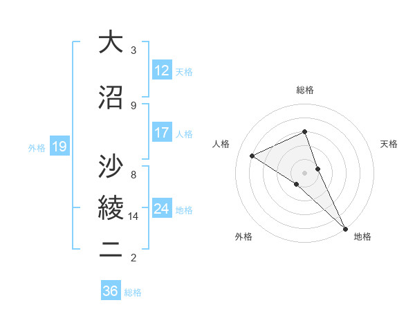 大沼 沙綾ニさんの外格は19画の1点!