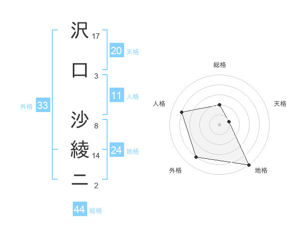 沢口 沙綾ニさんの総格は44画の2点!