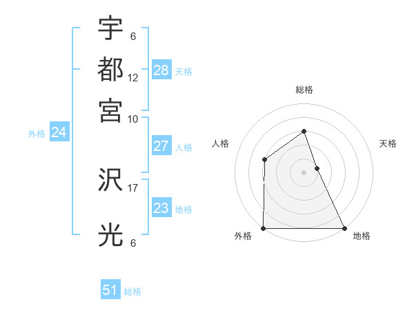 宇都宮 沢光さんの総格は51画の3点!