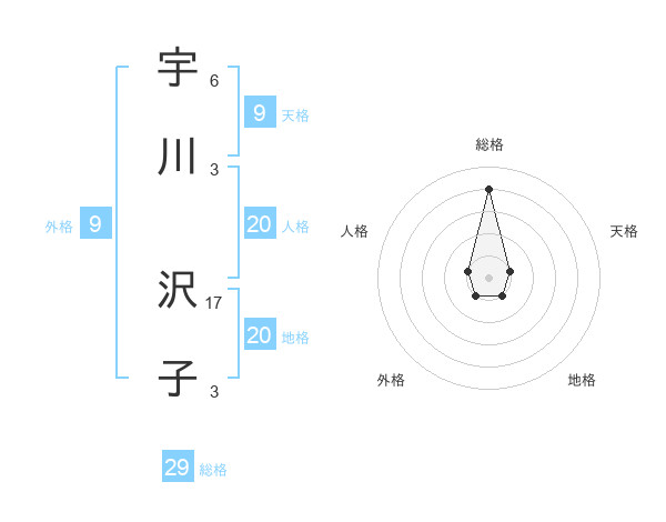 宇川 沢子さんを姓名の画数から五運を鑑定