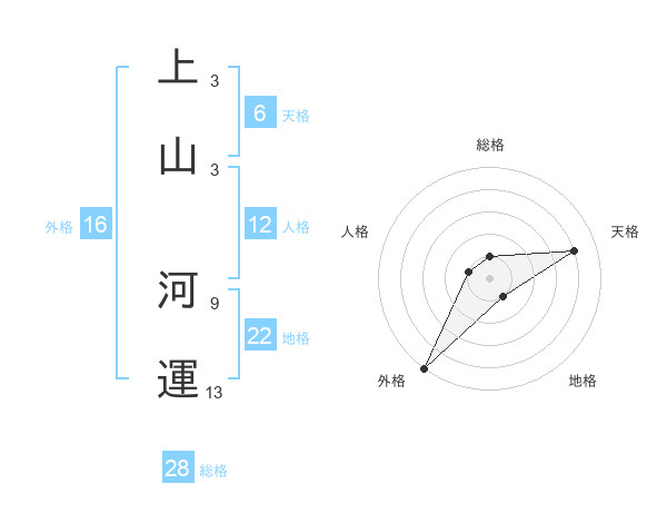 占い結果は姓名判断である以上、良い場合も悪い場合もありますが、決してお名前を誹謗中傷するものでなく、画数の自動計算によって得られたものです。また、本サイトの検索によって得られた鑑定結果で、第三者を誹謗中傷したり名誉を棄損するような行為を禁じます。