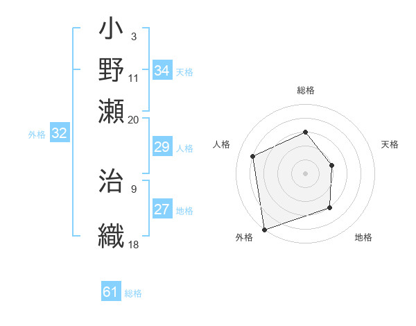 小野瀬 治織さんを姓名の画数から五運を鑑定